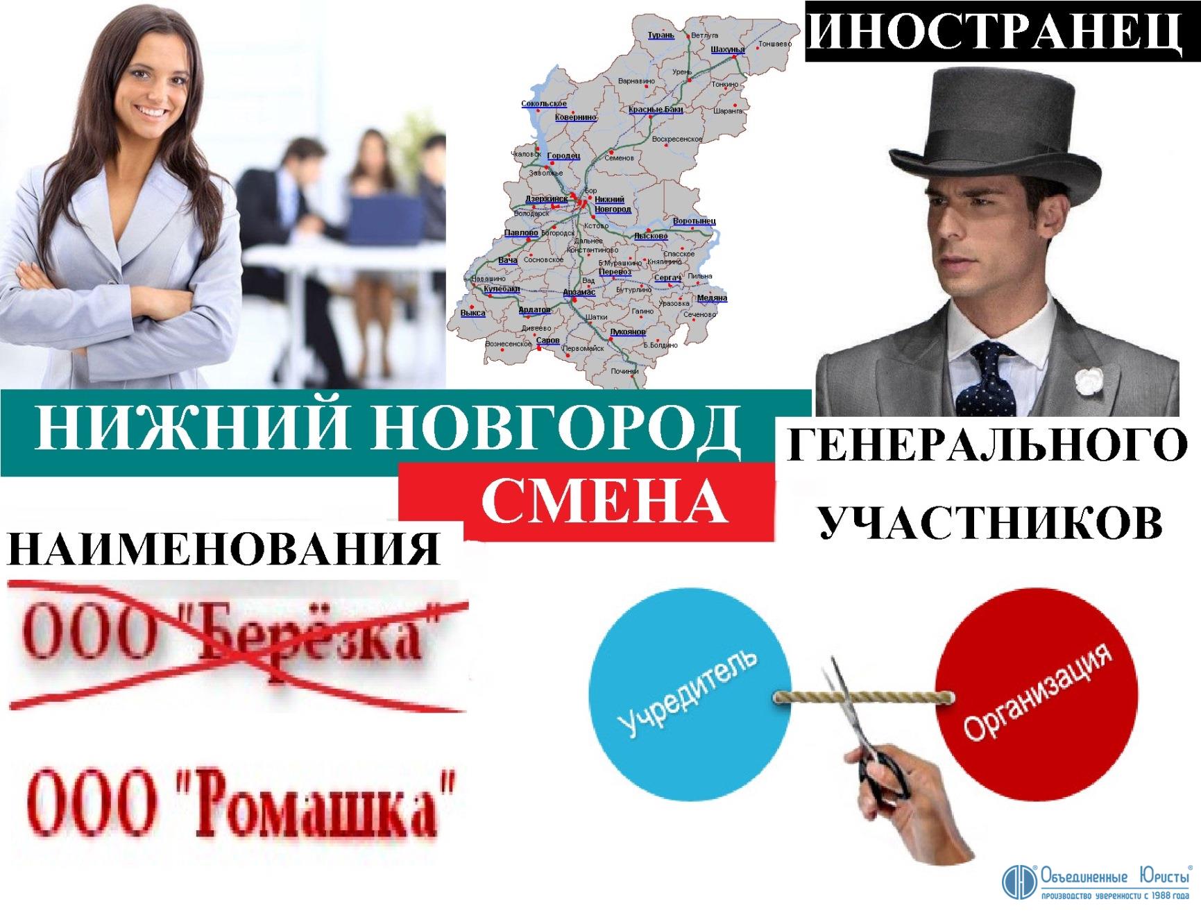 Смена наименования, участников (учредителей, акционеров) и генерального директора на других лиц, иностранных граждан в Нижнем Новгороде – это самая краткосрочная процедура по снятию полномочий и ответственности исполнительного органа юридического лица (предприятия, компании, организации, фирмы), и его участников с последующим прекращением всех отношений прежних участников и генерального директора с данным субъектом предпринимательской деятельности. Смена наименования служит дополнительной гарантией. Смена наименования, участников (учредителей, акционеров) и генерального директора на других лиц, иностранных граждан является самым быстрым и доступным способом альтернативной ликвидации.