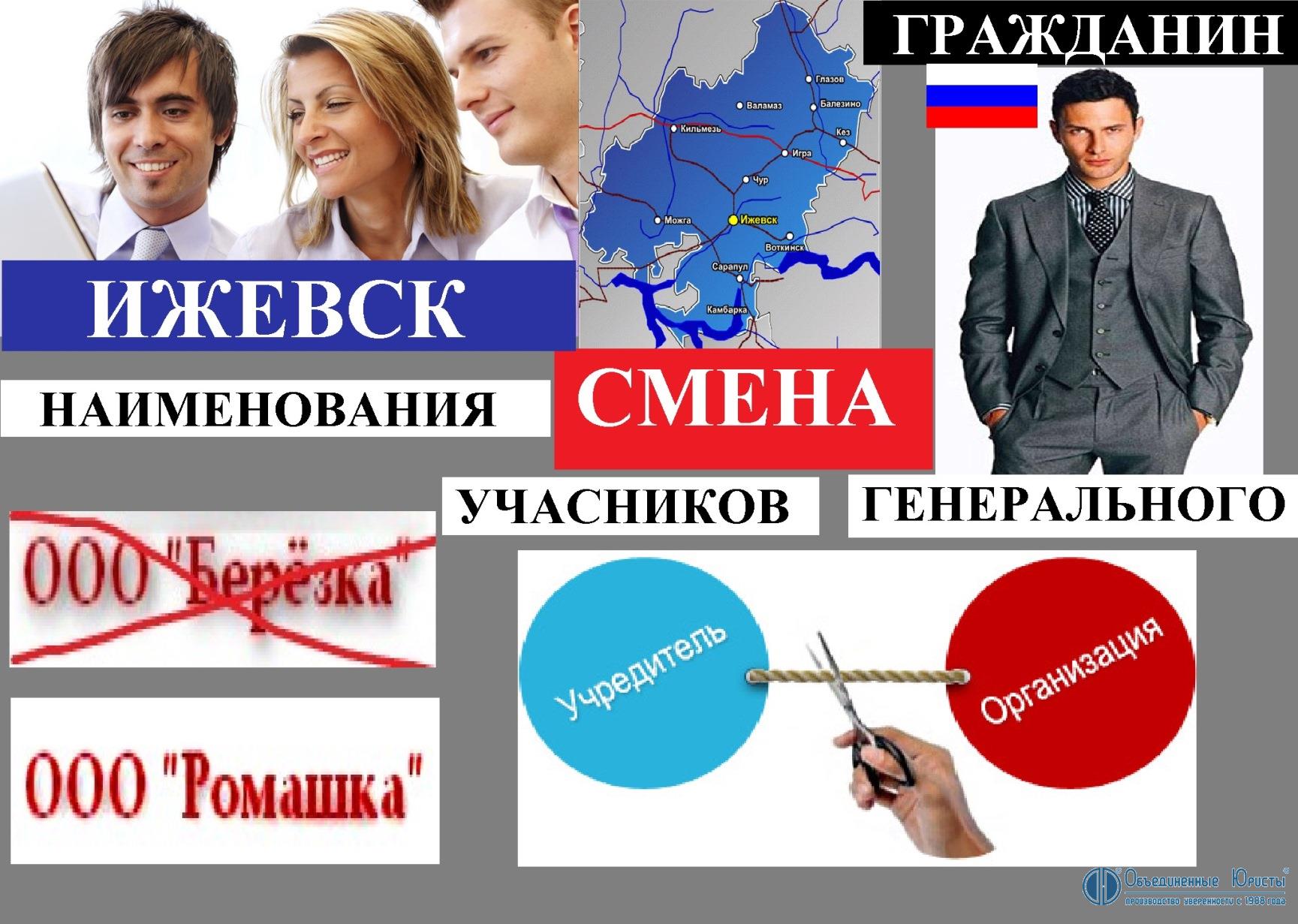 Смена наименования, участников (учредителей, акционеров) и генерального директора на других лиц, граждан РФ в Ижевске – это самая краткосрочная процедура по снятию полномочий и ответственности исполнительного органа юридического лица (предприятия, компании, организации, фирмы), и его участников с последующим прекращением всех отношений прежних участников и генерального директора с данным субъектом предпринимательской деятельности. Смена наименования служит дополнительной гарантией. Смена наименования, участников (учредителей, акционеров) и генерального директора на других лиц, граждан РФ является самым быстрым и доступным способом альтернативной ликвидации.